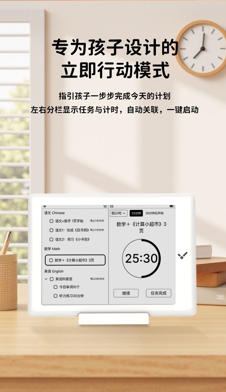 指引孩子一步步完成今天的计划,左右分栏显示任务与计时,自动关联,一键启动