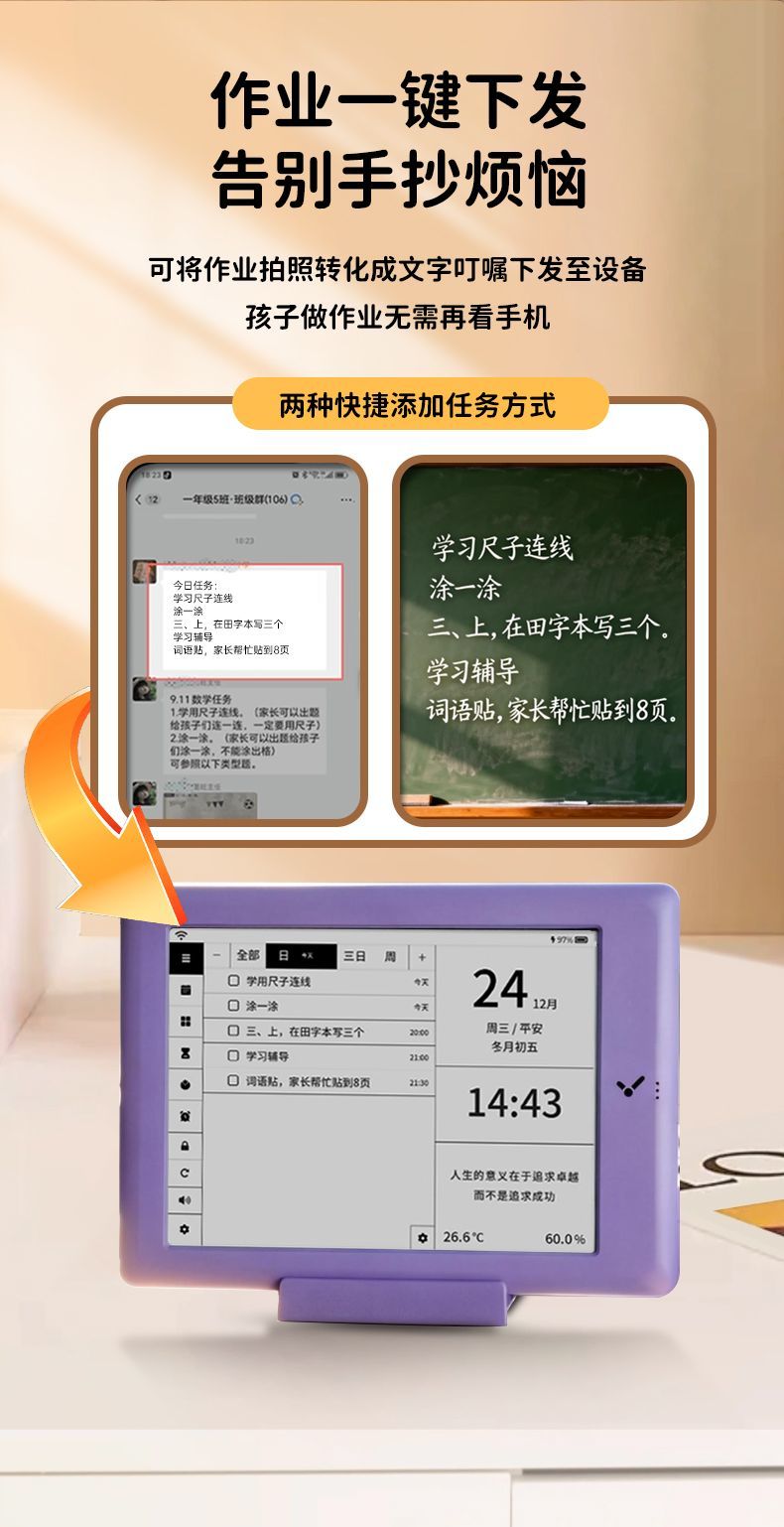 可将作业拍照转化成文字叮嘱下发至设备,孩子做作业无需再看手机